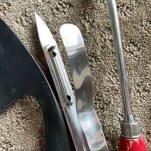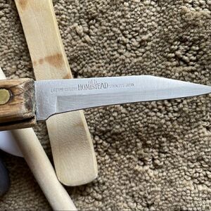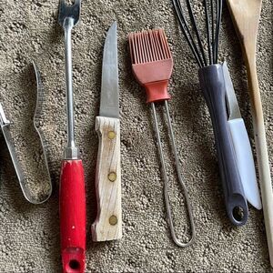 This bundle consists of 2 cooking spoons, a meat fork, a pie cutter, 3 small kitchen knives, an asparagus/ vegetable peeler, a whisk, a pastry brush. A number of these items are vintage but in good condition. Please see photos for signs of wear! Let me know if you have any questions.