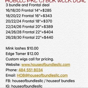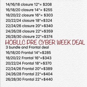 Three bundles with a closure or frontal. Lengths up to 30" available and 22" closures available. Edge control available and hair can be custom dyed upon request