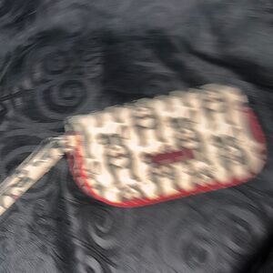 Charming wristlet with playful dog design. Features a secure zip closure and convenient wrist strap.