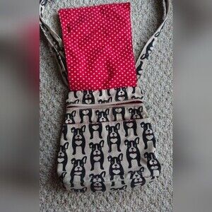 Cute polka dot lining. Outer zipper pocket on flap. Flap closure with two pockets under flap