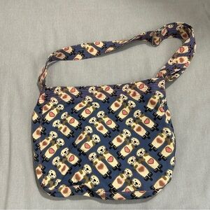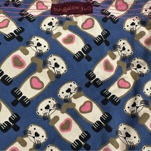 Adorable Bungalow 360 shoulder bag/crossbody, blue with a print of otters holding hands, interior is pink/white polka dot. Adjustable strap. 14"x11"x2". SO cute!