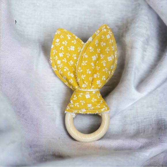 Bunny ear teether for sensory play and teething relief.