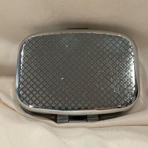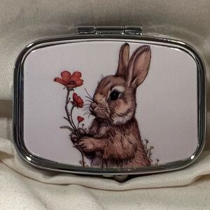 Gorgeous travel size Bunny Rabbit holding pretty flowers pill case with 2 compartments, use for medicine, vitamins. Pocket or purse use, keep it in the car. Also has a mirror on inner lid. Made with shockproof durable metal outer shell that protects and keeps meds and supplements safe from damaging moisture and oxidation. Great little gifts for hostesses, teachers, stockings, etc. I ship fast usually within a business day!