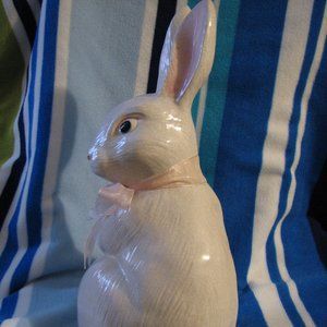 Ceramic Glazed White Tall Rabbit with Pink Sheer Ribbon around her neck; Blue Eyes that are painted (not beads or glass)