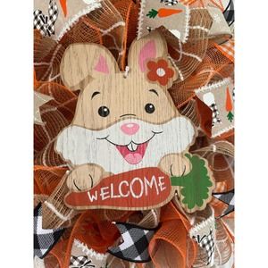 Bunny Rabbit Carrot Welcome Buffalo Check Mesh Ribbon Spring Easter Wreath