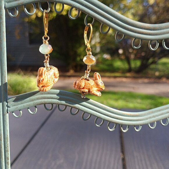 Hand painted ceramic bunny beads, brass gold tone beadcaps, faceted mottled light blue and soft brown glass Czech beads, quality brass earring lever findings.