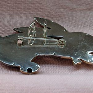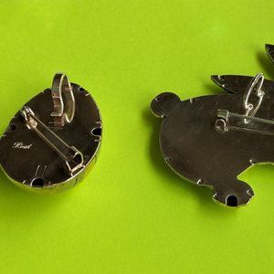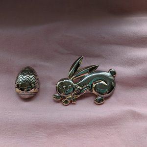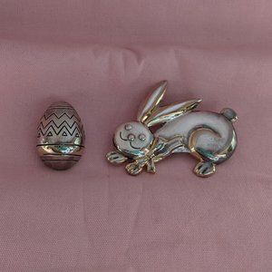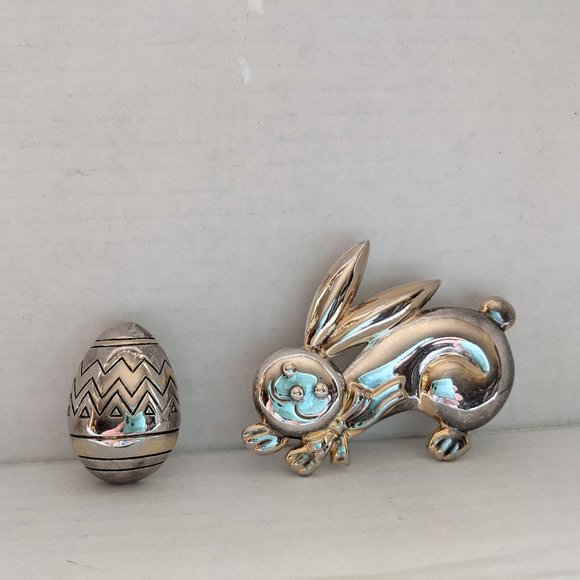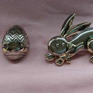 2 vintage silver tone pins sold by "Best" Products (1957-1997). Sydney & Frances Lewis's (owners) jewelry is collectible and famous for it's unique silver and gold tone combination of metals. It was hard to get a good photo of these because the finish is like a mirror and reflects everything. These 2 pins both have silver and gold tones and can be worn as a pin/brooch or on a chain/ribbon/scarf/etc as a slide or pendant. The bunny measures 2.25" x 3". The egg measures 1.25" x 1.5". Both pins have a loop on the back to thread a ribbon, chain, or scarf through.
