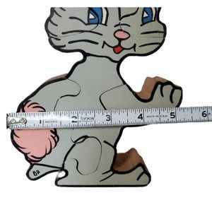 This very cute bunny puzzle stands 8"H x 5"W x 1.75"D and was hand painted by Diane Pope in the late 70s/ early 80s. The 4 large pieces are the perfect size for little hands!