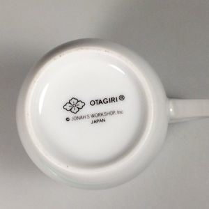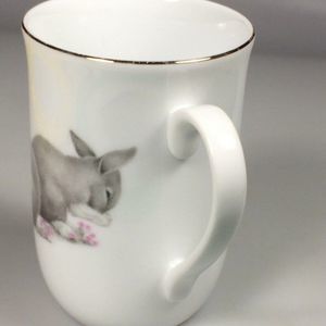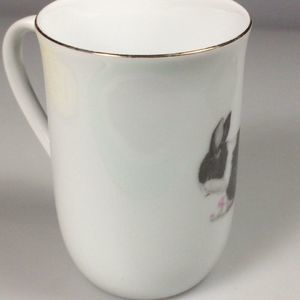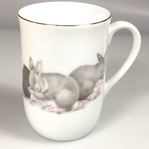 Wonderful porcelain coffee mug by Otagiri. Features adorable Easter rabbits on it. Made in Japan. Fabulous condition for its age; no chips, cracks. Has some minor wear to gold rim.