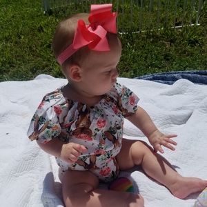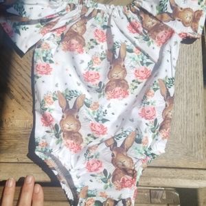 Boutique style adorable rhomper, lightweight with snap in between legs and off shoulder option at neckline