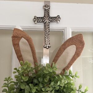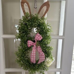 Embrace the Easter spirit with this charming bunny-shaped wreath, crafted from plastic green foliage and adorned with a delightful pink gingham bow. Perfect for adding a festive touch to your holiday decor. Appropriately 24" tall and 12" at longest width.