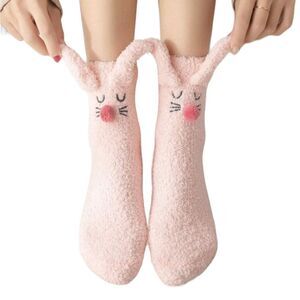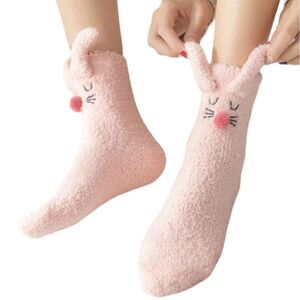 New! Bunny ears socks. Soft and cozy crew socks with cartoon rabbit face, pom pom nose, and ears. Soft pink color. Would make a great gift! Bundle to get a discount.