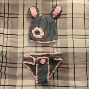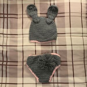 Gray knit hat with pink edging. Stitched bunny ears on top and flower on the front.