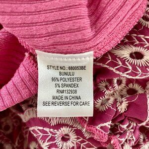 The Bunulu Pink Ribbed Textured Top is a women's small, boasting detailed short sleeves. Made from 95% polyester and 5% spandex, it ensures comfort and durability.