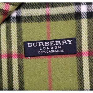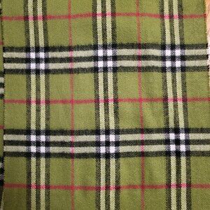 Burberry fringed muffler/scarf. Sage green nova check pattern. 100% cashmere. Measures 11x64 inches plus 2.5 inches of fringe on both ends. In excellent condition with no holes, tears, or stains.