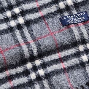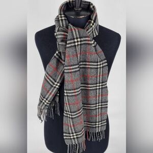 Classic designer Burberry London Made In England dark grey nova check 100% Wool scarf with fringed edges.