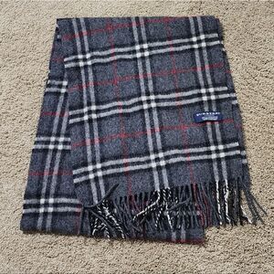 Classic designer Burberry London Made In England dark grey nova check 100% Wool scarf with fringed edges.