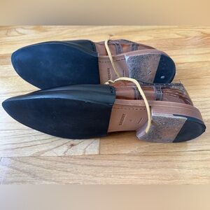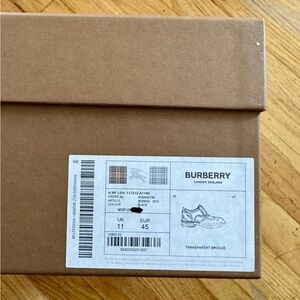 Retro-futuristic Burberry brogues featuring black and brown leather with a clear vinyl outer layer. Designed with perforated detailing, tan leather lining, and a stacked leather sole. Lace-up closure with tan laces, these unique shoes are perfect for adding a statement to formal or semi-formal outfits. Made in Italy, size EU 45, and in excellent pre-owned condition with minor wear. Comes with original packaging.”