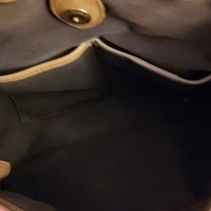 3 compartments. Middle compartment has Zipper. The one on sides have snaps. This was custom ordered. This color was not sold in stores. Dark brown interior. Excellent condition