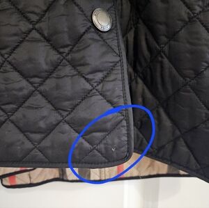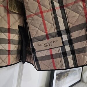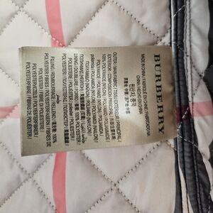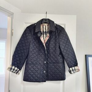 Lightweight, single-breasted, quilted jacket with a turn-down collar, epaulets, and logo-embossed snap button closure. Features the classic Burberry check lining, which is visible when the sleeves are rolled up and collar is turned up