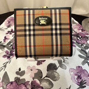 Burberry Check Colored Small Wallet. The canvas is in perfect condition, and the inner part of the credit card slots and coins are also in perfect condition. The only area that I see wrinkles in is the inner billfold. Overall, the wallet is in perfect condition. It includes a Certificate of Authentication.
