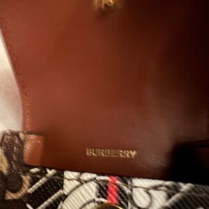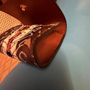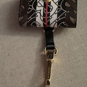 Coated canvas pouch featuring pattern in black, white, red, and tones of brown throughout. Grained leather trim in brown throughout. Logo-engraved lanyard clasp fastening at top. Foldover flap with press-stud fastening. Charger opening at base. Logo stamp in gold-tone at interior. Grained leather lining in brown. Gold-tone hardware. Approx. 2.75 length x 2.25 height x 1 width.Supplier color: Bridle brown. This is 100% authentic and its been used once.