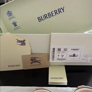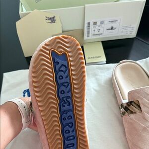 Elegant Burberry mules. Classic design with a chic look. Perfect for any occasion. Gift but Iβm size 6.5-7 theyβre are a bit bigger -38 UE size m. inside is molded for extra comfort. See pic. Thanks for checking this out. πAll reasonable offers will be welcomed