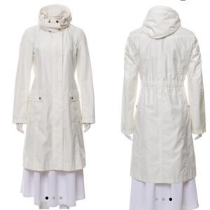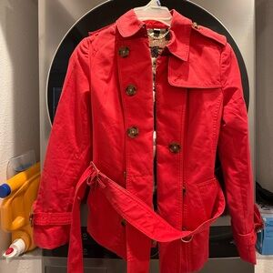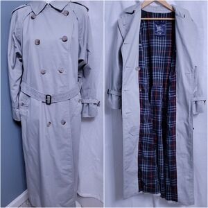 Classic Burberry trench coat in beige. Features signature check lining. Perfect for sophisticated style.
