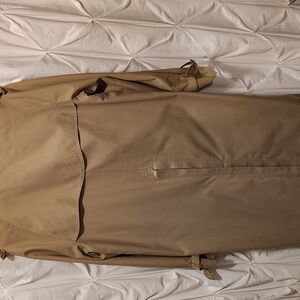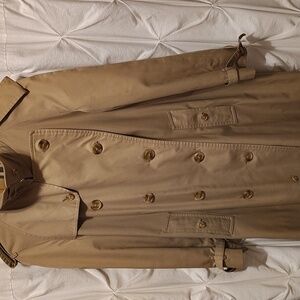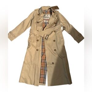 Stylish Burberry trench coat. no belt. no size inside the coat. it's oversized on me. I believe it's is 14. Features classic plaid lining. Timeless design for any wardrobe. Still a bit on the stiffer side probably from lack of wear. Leather covered buckles have some wear. Otherwise all buttons are on and good. This coat will be dry cleaned before shipment.