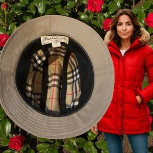 Chic bucket hat with iconic Burberry check interior. Versatile and stylish.