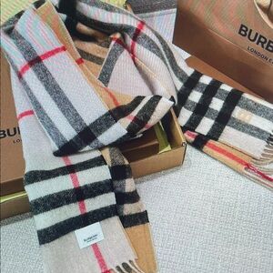 Stylish Burberry scarf with beige and black check pattern. Features red and tan accents. Perfect for adding elegance.