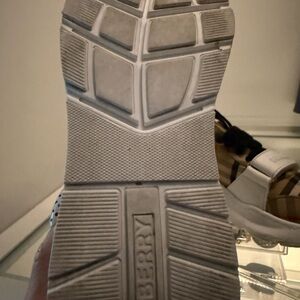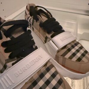 Stylish Burberry sneakers with iconic checkered pattern. Features beige and black design with white accents. Comfortable and trendy.