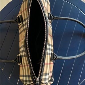 Classic Burberry plaid design. Features black leather handles and trim. Stylish and elegant.