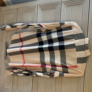 Elegant Burberry shirt with bold plaid design. Features beige, black, and red tones.