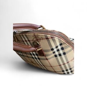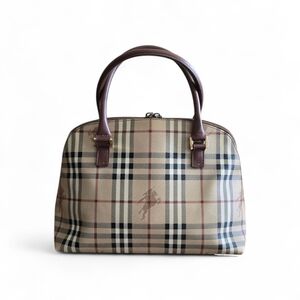 Stylish satchel with iconic check pattern. Features sturdy handles and zip closure.