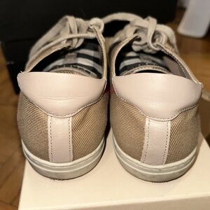 Chic Burberry sneakers with signature plaid design. Features beige, red, and black accents.