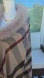 Chic Burberry wrap featuring a beige and red plaid pattern. Accented with luxurious fur trim.