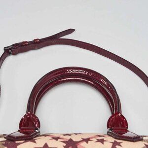 Handles: Double rolled leather handles and single detachable adjustable patent leather shoulder strap