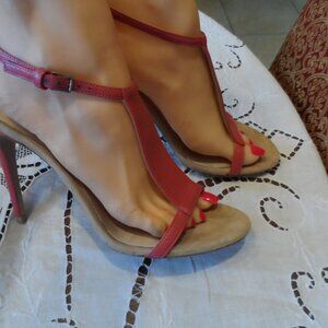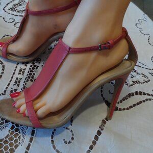 Burberry Berry Pink Leather "T" Strap Heeled Sandals Size 38.5B