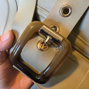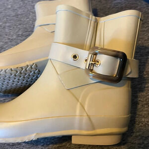 Burberry Big Buckle Rain Boots, size 36. Great condition, light wear to sole, surface cracking on one straps pictured. Color is eggshell with a tint of yellow. Light marks.