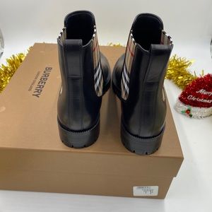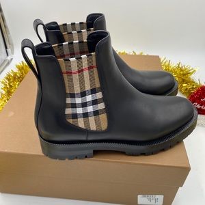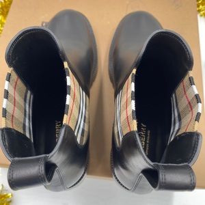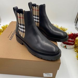 Sleek black leather ankle boots. Iconic Burberry check pattern on sides. Durable sole for comfort.