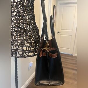 This stylish tote is crafted of finely calfskin leather in black and brown leather trim. The bag features rolled leather top handles, an optional adjustable shoulder strap with gold hardware, and Burberry House Check canvas panels. The top is open to a partitioned Burberry House Check fabric and brown leather interior with zipper and patch pockets. Bag is preowned in excellent condition. The threading is loose on of the side pockets as shown in one of the pictures.