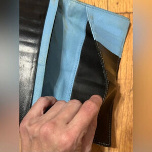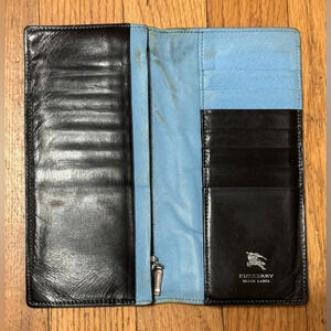 *See photos for all imperfections and use. There are scuffs on the edges as well as inside the wallet on the blue leather. There are also small little dots on the leather near the Burberry stamp inside the wallet.