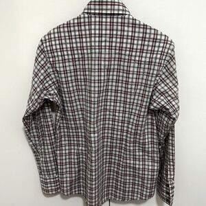 Burberry Black Label Japan women’s long sleeve black & pink plaid with silver metallic thread blouse. Features button down pointed collar, front button closure, 2 buttoned chest pockets, cuff with 3 buttons, embroidered logo at left hip & logo buttons. , Western style stitching detail. Shirttail hem.