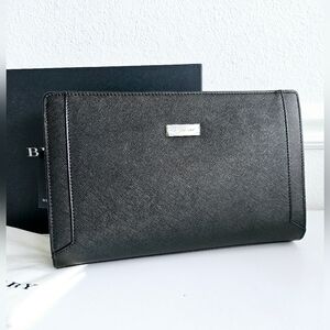 Brand new authentic Burberry black leather clutch with a spacious interior, concealed wristlet strap, back pocket, and silver hardware. It has a very structured silhouette and can be worn as a clutch or crossbody (with an insert). Includes original box, dustbag, and tags.
