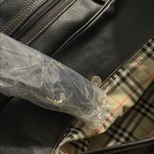 Elegant black leather handbag. Features sturdy handles. Classic Burberry design.