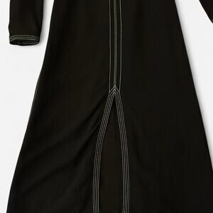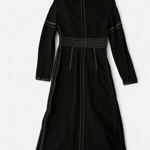 Long sleeved midi dress, black with neon green stitching, mock neck, front slit, wool