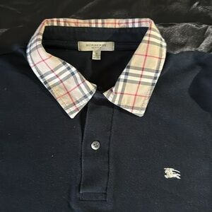 Elegant dark blue polo with signature checkered collar. Iconic Burberry style.