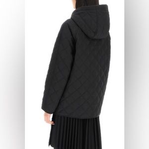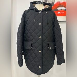 Stylish black quilted jacket. Features tan accents. Hooded design with button closure. Perfect for cool weather.