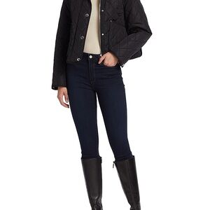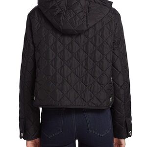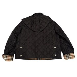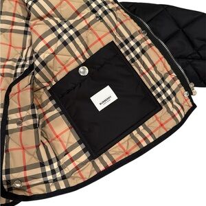 Elegant black quilted puffer. Features classic Burberry lining. Ideal for cold weather.